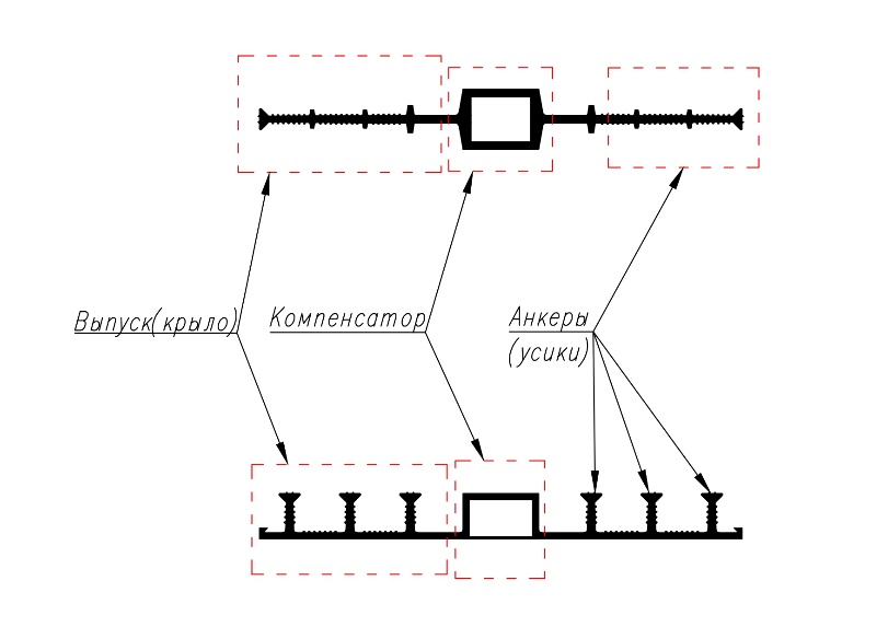 - Выпусков (крыльев). Это части гидрошпонки, которые сцепляются с телом бетона. Правый и левый выпуск бетонируются отдельно при первой и второй стадии бетонирования деформационного шва.