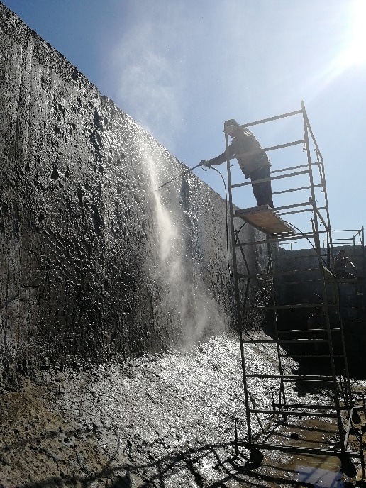 Перед началом ремонта защитного слоя бетона необходимо очистить поверхность от любых загрязнений, красочного покрытия, ослабевшего крошащегося слоя материала. Его отбивают до здорового бетона, который промывают мойкой высокого давления. При оголении арматуры её обрабатывают специальными составами.